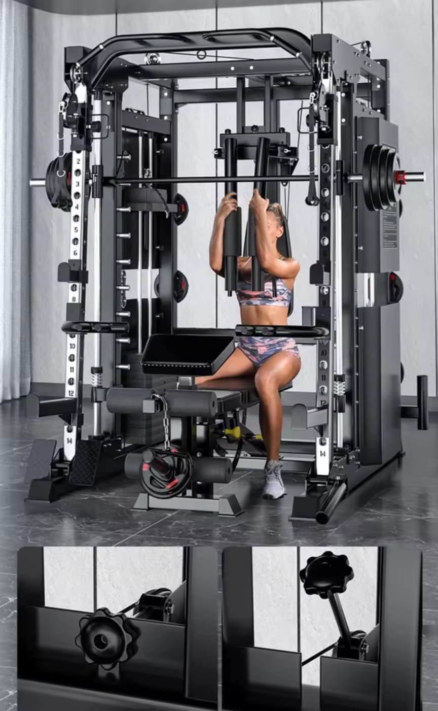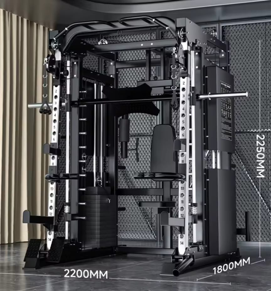 • Smith Machine: Provides a guided barbell path for safe and controlled lifting, ideal for exercises like squats, bench presses, and shoulder presses with enhanced safety catches.